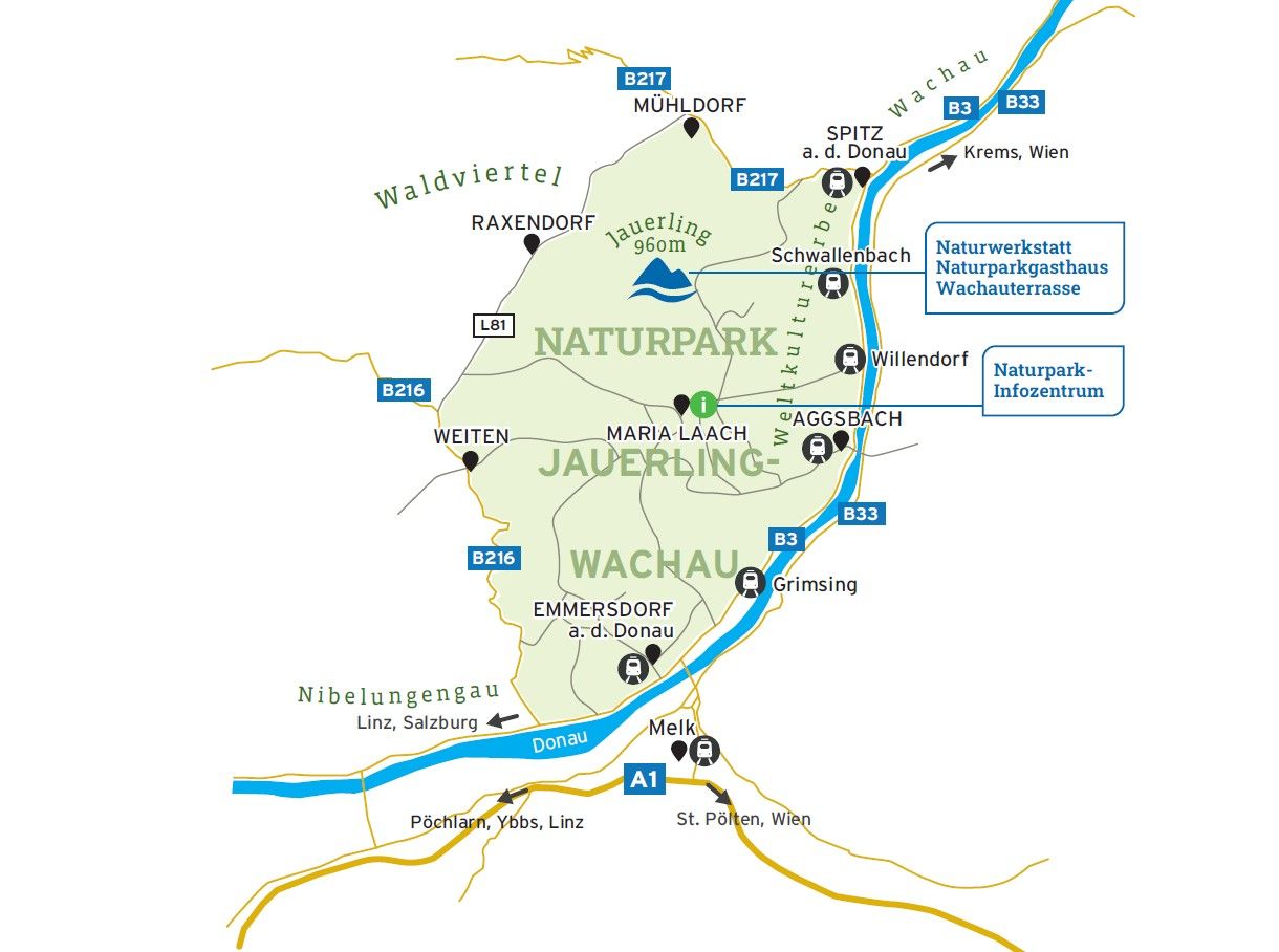 Der Naturpark Jauerling-Wachau umfasst die 7 Naturparkgemeinden Mühldorf, Spitz, Aggsbach, Emmersdorf, Weiten, Raxendorf und Maria Laach mit einem Gesamtgebiet von 11.558 ha. So kommen Sie ins Naturparkgebiet: