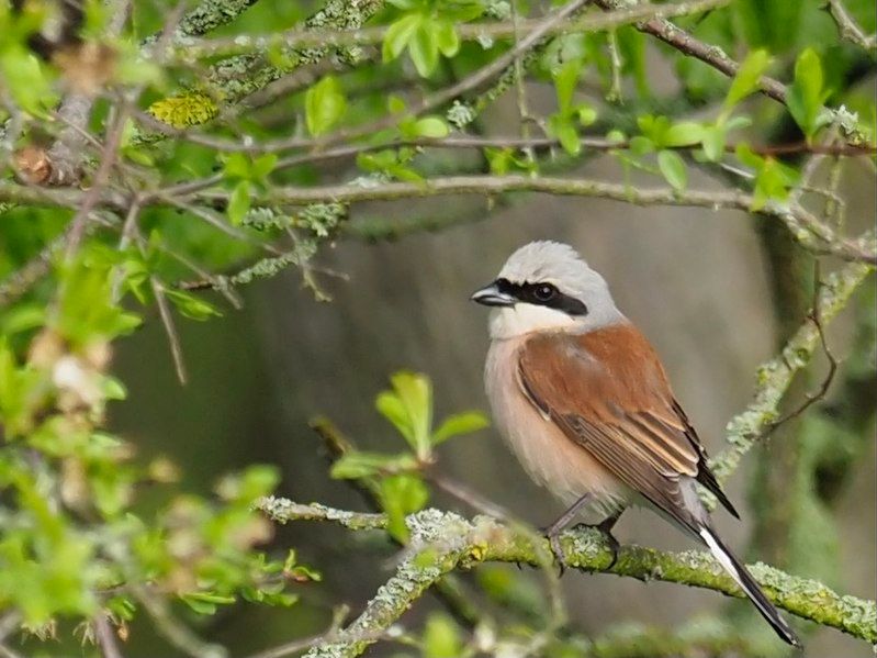 Der Neuntöter ist etwa spatzengroß. Besonders auffällig ist das Männchen: grauer Kopf, rotbrauner Rücken und eine schwarze „Augenmaske“. Das Weibchen ist dezenter braun gefärbt und damit im Gebüsch gut getarnt.